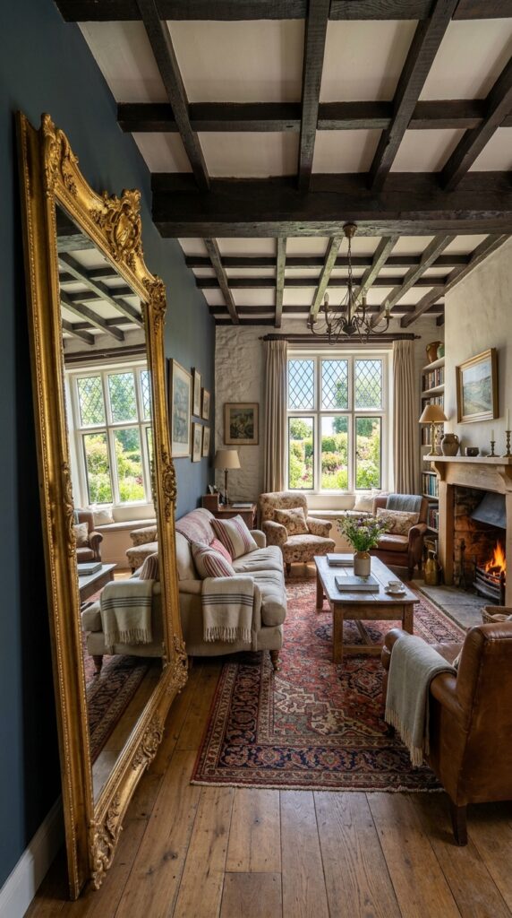 Gilded Frames: You prop a massive heavy gold mirror against the dark accent wall. Hanging huge glass sheets requires serious hardware and causes extreme installation anxiety. You skip the drill completely – you let gravity do the hard work. The ornate vintage molding adds incredible architectural interest instantly.