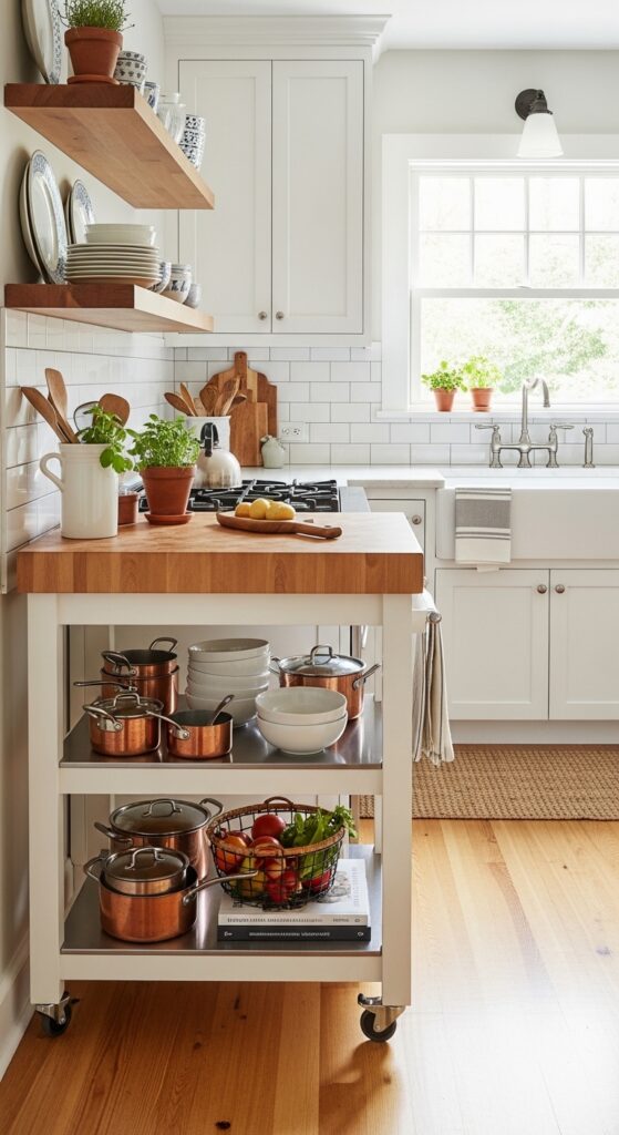 Counter space vanishes the second you set down a coffee maker and a toaster. You wheel in a rolling kitchen cart, and boom – instant prep area that moves wherever you need it. These carts come with shelves or drawers underneath, giving you storage for pots, pans, or pantry overflow. You roll it next to the stove when you’re cooking, push it against the wall when you’re done, or even use it as a makeshift bar cart when friends come over. The flexibility’s unbeatable. You find them at big box stores, vintage shops, or IKEA for every budget imaginable.