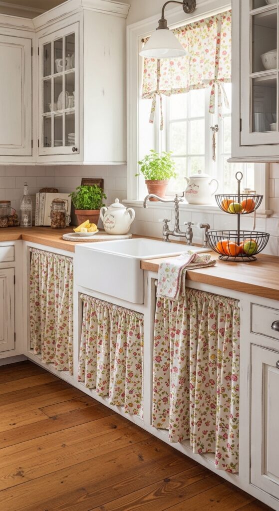 Standard cabinet doors require clearance to swing open, and in a tiny kitchen, that clearance eats up valuable space. You remove lower cabinet doors completely and hang fabric curtains on tension rods instead. Curtains take up zero swing space and add softness to what’s usually a hard-surfaced room. You change the fabric whenever you want a new look – florals for spring, stripes for summer, whatever matches your current vibe. This solution works especially well under the sink where plumbing makes shelves awkward anyway. You hide cleaning supplies behind cheerful fabric instead of beat-up cabinet doors. Cost? About twenty bucks for fabric and rods.