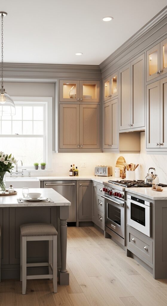 Crown molding adds the finishing touch: You cap off those ceiling-height cabinets with crown molding that bridges the gap between cabinet and ceiling, creating a seamless look that screams expensive renovation instead of budget DIY project.