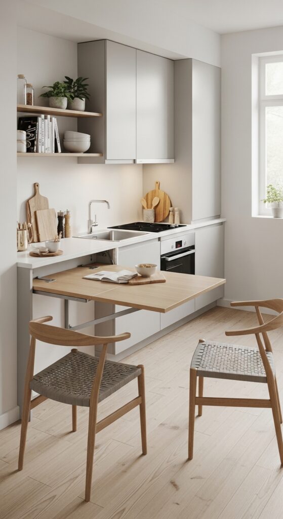 You need a table for eating or extra prep space, but a permanent table dominates your small kitchen. You install a fold-down wall-mounted table that disappears when you’re not using it. These tables come in every style from rustic farmhouse to sleek modern. You mount it to a sturdy wall, fold it up for meals or projects, then tuck it away when you’re done. Some versions include storage underneath or fold out from existing cabinetry. You reclaim your floor space while still having a proper eating area. This setup’s perfect for morning coffee or dinner for two without the table taking over your life permanently.
