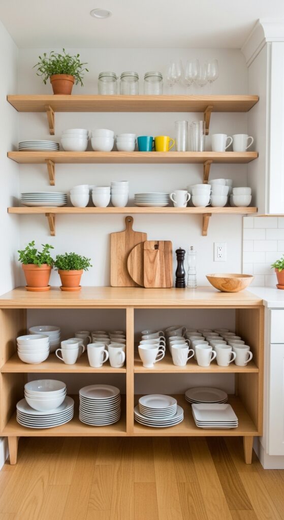 Strategic placement keeps it functional: You install shelves where you actually grab things daily – near the sink for glasses and everyday dishes, by the stove for oils and spices – because pretty shelves that make you walk across the kitchen seventeen times while cooking defeat the whole purpose.