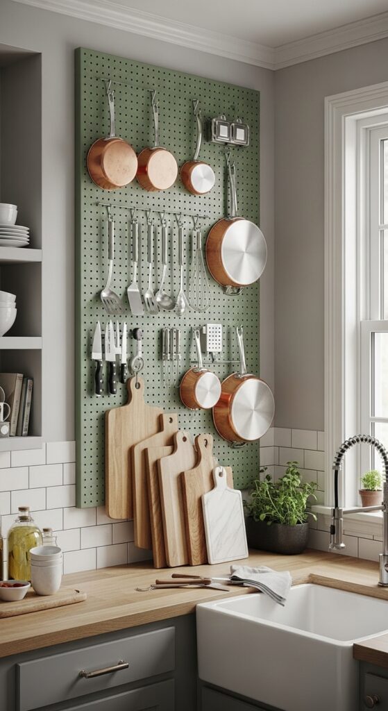 Mix pegboard with magnetic strips: You add a magnetic knife strip nearby for your blade collection, creating a compact command center where all your most-used tools live in one organized zone instead of scattered across three different drawers.