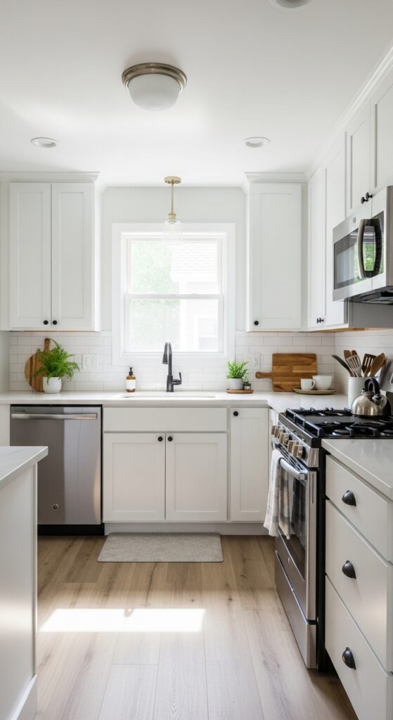 Paint cabinets white or pale gray to reflect light. Replace upper cabinets with open shelving to eliminate visual barriers. Install under-cabinet lighting to brighten surfaces and eliminate shadows. Choose slim, counter-depth appliances. Keep countertops clear – every item sitting out makes your kitchen feel smaller. Use glossy backsplashes to bounce light around.