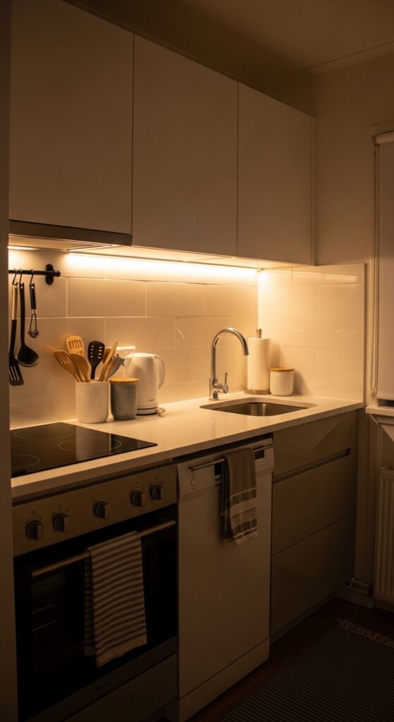 Dark corners make small kitchens feel even smaller and more claustrophobic. You install LED strip lights under your upper cabinets, and the whole room brightens instantly. This lighting illuminates your countertops for actual work while eliminating shadows that eat up visual space. The warm glow makes your kitchen feel welcoming instead of cramped. Under-cabinet lights come in plug-in or hardwired versions, and the plug-in types take minutes to stick up. You control them with remotes, switches, or even your phone with smart versions. Better lighting changes everything.