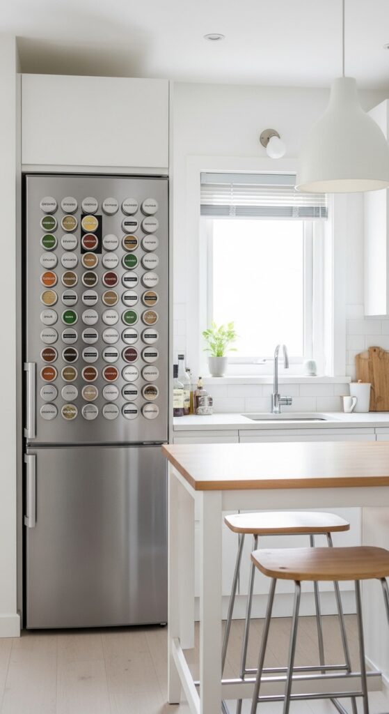 Spice bottles multiply like rabbits and devour drawer space you desperately need for other stuff. You transfer your spices into magnetic containers and stick them directly on your refrigerator side or a metal strip on the wall. Everything’s visible and accessible, which means you actually use that smoked paprika instead of forgetting it exists. The vertical storage frees up an entire drawer or cabinet shelf. You label the tops so you can identify spices at a glance. Magnetic spice storage looks clean and organized – almost like you have your life together. Almost.