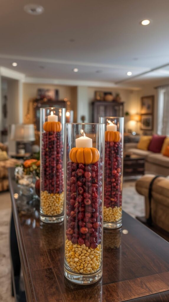 The Foundation Trio: Drop dried corn kernels in the bottom third of your hurricane vase, creating a golden base layer. Add cranberries in the middle section for a pop of deep red color. Top it off with mini pumpkins or gourds that sit right at the rim level, and stick a pillar candle in the center. The layers stay separated naturally, and you change them out easily when December rolls around.